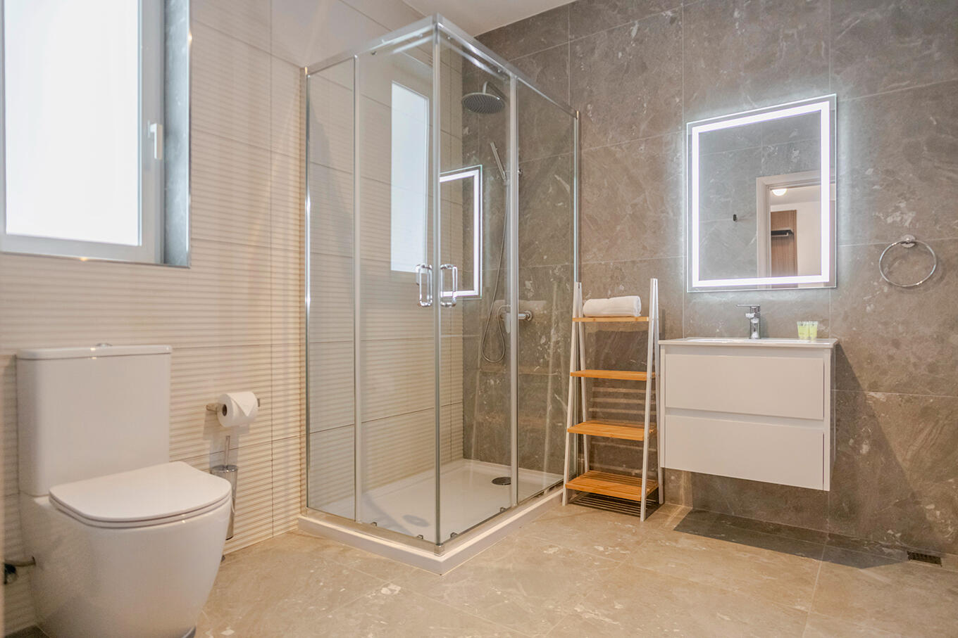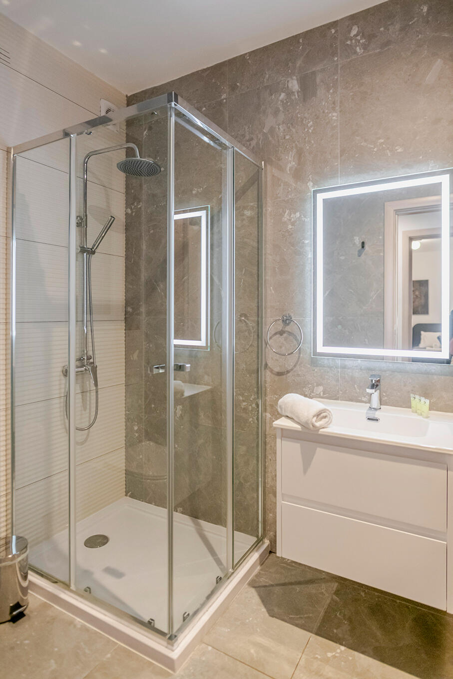Stylish bathrooms with showers and toiletries
